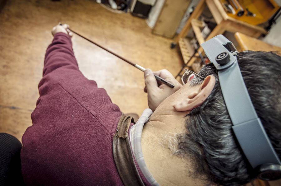 It is very important that the bow be cleaned every time the hairs are changed. The skin of the bow handle should also be changed because it absorbs the acidic sweat from the hands that can damage the wood and cause it to rot. Whatever deformation the bow rod has undergone – common defects like the loss of curvature or a lateral curve – must also be fixed.